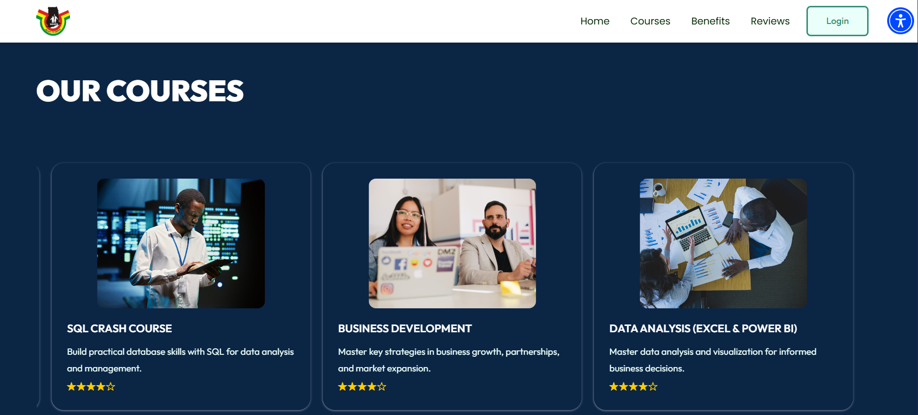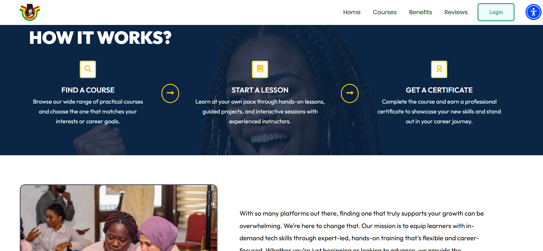 Online learning platform for national service personnel — courses in UI/UX, digital marketing, data analytics, Python, mobile app dev. User-friendly with enrollment and hands-on training focus.